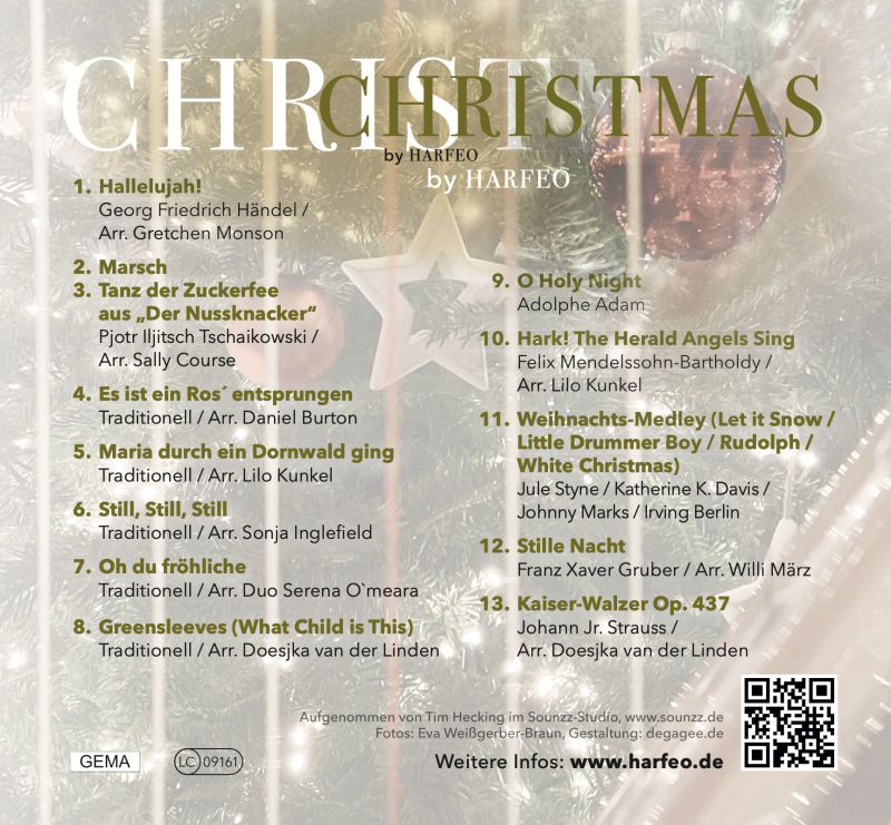 Festlich, traditionell, innig, berührend, erhebend, frech und fröhlich führt Harfeo Sie durch Ihre alten und neuen Weihnachts-Erinnerungen. Sogar einen Hauch 'Frohes Neues', in Form des Kaiser-Walzers von Johann Strauss Jr., finden Sie auf Ihrer neuen Lieblings-CD!