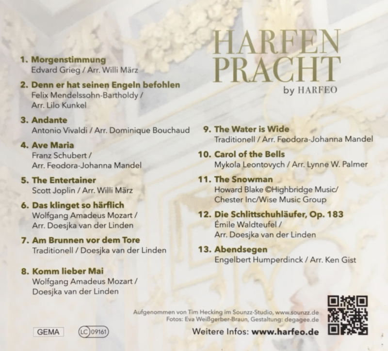 Das Repertoire unserer 'Harfenpracht'-CD besteht aus einer sehr abwechslungsreichen und wohltuenden Mischung von Musikstücken, die dafür prädestiniert ist, Sie durch das ganze Jahr hindurch zu begleiten. Sowohl frühlingshaft als auch weihnachtlich, passend zur Morgen- und Abendstimmung, nicht nur beruhigend und harmonisierend, sondern auch aufregend und erfrischend!